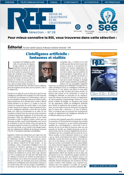Vous trouverez dans ce REE Sélection N°28 l’éditorial de Jean-Gabriel Ganascia au cahier azur consacré à l’Intelligence Artificielle qui résume les intérêts ou les interrogations qu’elle présente avec son arrivée dans nos organisations et nos vies.