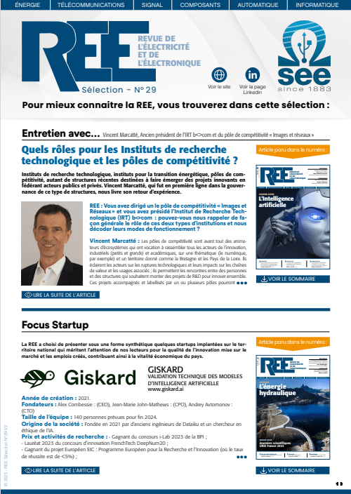 Ce REE Sélection N°29 présente en première partie deux sujets tournés vers l’innovation avec l’entretien de Vincent Marcatté qui a dirigé le pôle de compétitivité « Images et Réseaux » et présidé l’Institut de Recherche Technologique (IRT) et, dans le cadre des articles habituels consacrés aux startup, l’entreprise Giskard dont l’activité est dédiée à l’amélioration de la qualité des systèmes d’Intelligence Artificielle.