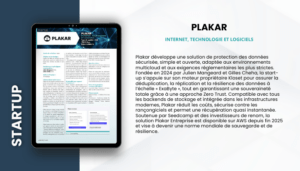 Plakar développe une solution de protection des données sécurisée, simple et ouverte, adaptée aux environnements multicloud et aux exigences réglementaires les plus strictes. Fondée en 2024 par Julien Mangeard et Gilles Cheha, la start-up s’appuie sur son moteur propriétaire Kloset pour assurer la déduplication, la réplication et la résilience des données à l’échelle « ExaByte », tout en garantissant une souveraineté totale grâce à une approche Zero Trust. Compatible avec tous les backends de stockage et intégrée dans les infrastructures modernes, Plakar réduit les coûts, sécurise contre les rançongiciels et permet une récupération quasi instantanée. Soutenue par Seedcamp et des investisseurs de renom, la solution Plakar Entreprise est disponible sur AWS depuis fin 2025 et vise à devenir une norme mondiale de sauvegarde et de résilience.